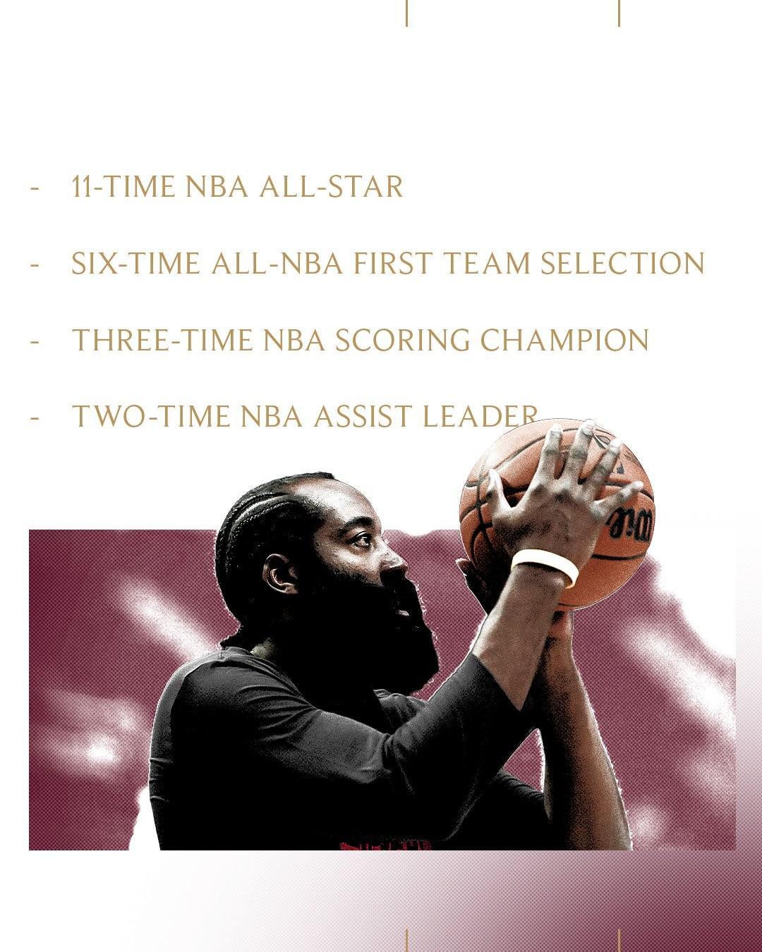 骑士还为哈登制作了历史荣誉海报:11次全明星、6次一阵、3次得分王、2次助攻王。